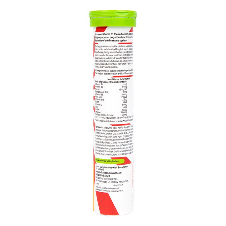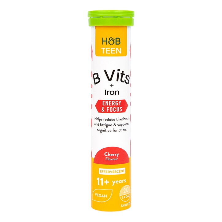 Holland & Barrett Teens Energy & Focusშუშხუნა ტაბლეტები შეიცავს B ჯგუფის ვიტამინებს და რკინას. ეს ტაბლეტები ხელს უწყობს დაღლილობისა შემცირებასა და აუმჯობესებს კოგნიტური ფუნქციებს.თიამინი (ვიტამინი B1) მონაწილეობს ენერგიის გამომუშავების მეტაბოლიზმის ნორმალურ პროცესში.